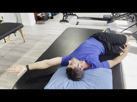 Lie on your side with your knees bent and stacked, arms extended straight in front of you at shoulder height, palms together. Keep your knees glued together. Slowly lift the top arm and rotate it open toward the floor behind you, letting your head and eyes follow. The goal is to get the back of the top hand as close to the floor on the other side as you can without letting the knees come apart.